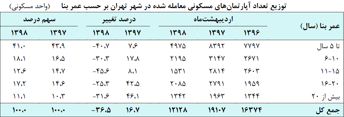 بررسی توزیع تعداد واحدهای مسکونی معامله شده در شهر تهران به تفکیک عمر بنا در اردیبهشت ماه سال ۹۸ حاکی از آن است که از مجموع ۱۲ هزار و ۱۲۸ واحد مسکونی معامله شده، واحدهای تا ۵ سال ساخت با سهم ۴۱ درصد بیشترین سهم را به خود اختصاص داده‌اند. سهم مذکور در مقایسه با اردیبهشت ماه سال قبل ۲.۹ واحد درصد کاهش یافته و در مقابل به سهم واحدهای با قدمت ۶ تا ۱۰ سال و بیش از ۱۵ سال افزوده شده است.